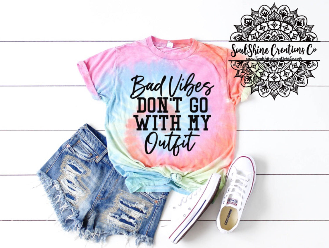 Bad Vibes don’t go with my Outfit tie dye shirt- (Color of shirt in photo is Neon, for reference)