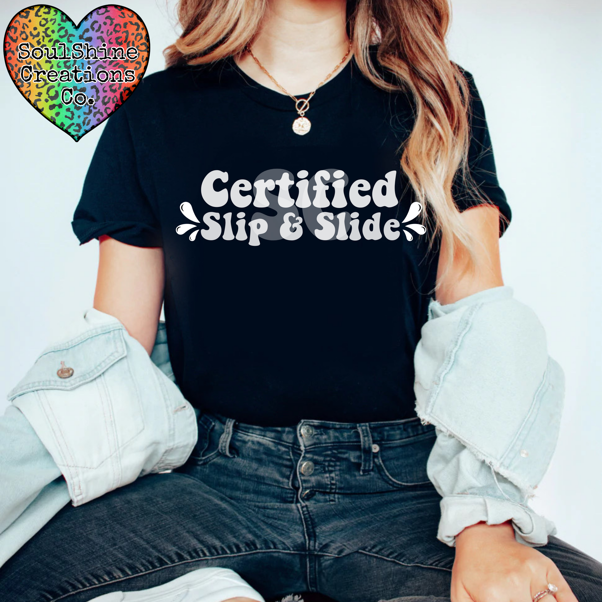 Our Certified Slip & Slide is the perfect Summer Tee! This shirt features a hilarious design that is sure to bring a laugh to any occasion. Enjoy the comfort of a lightweight fitted cotton tee while showing off your sense of humor!