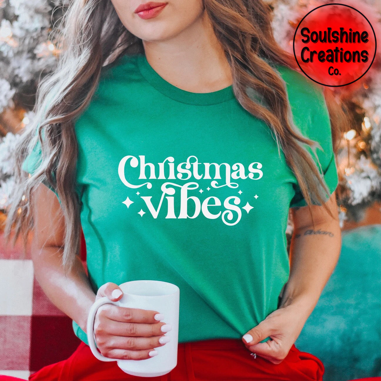 Christmas Vibes Shirt- (Color of shirt in photo is Kelly Green, for reference)