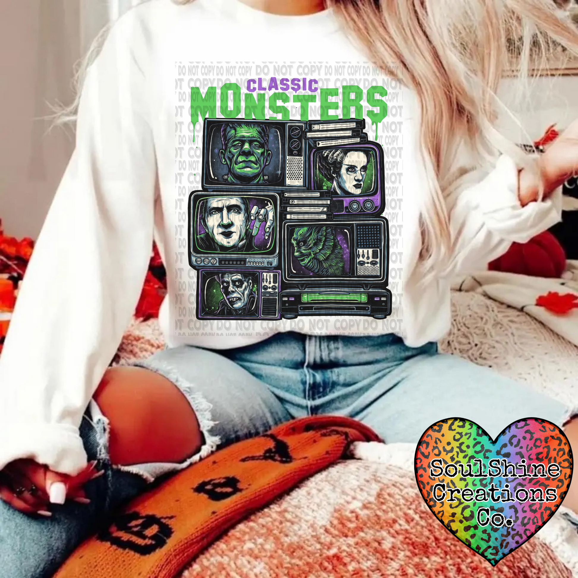 This Classic Monsters Tee or Sweater is perfect for any retro-loving Halloween enthusiast! Show off your spooky style in this unique design - sure to make you the life of the party!