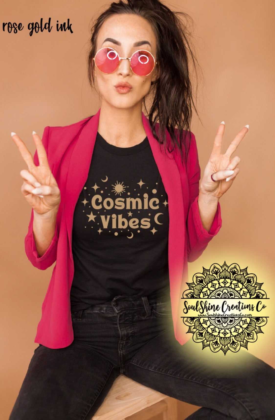 Cosmic Vibes Shirt- (Screen Print is Metallic Rose Gold-Color of shirt in photo is Black, for reference)