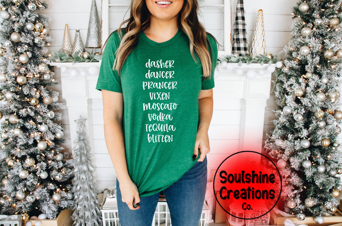 Dasher Dancer Prancer Vixen Moscato Vodka Tequila Blitzen Shirt- (Color of shirt in photo is Heather Grass Green, for reference)