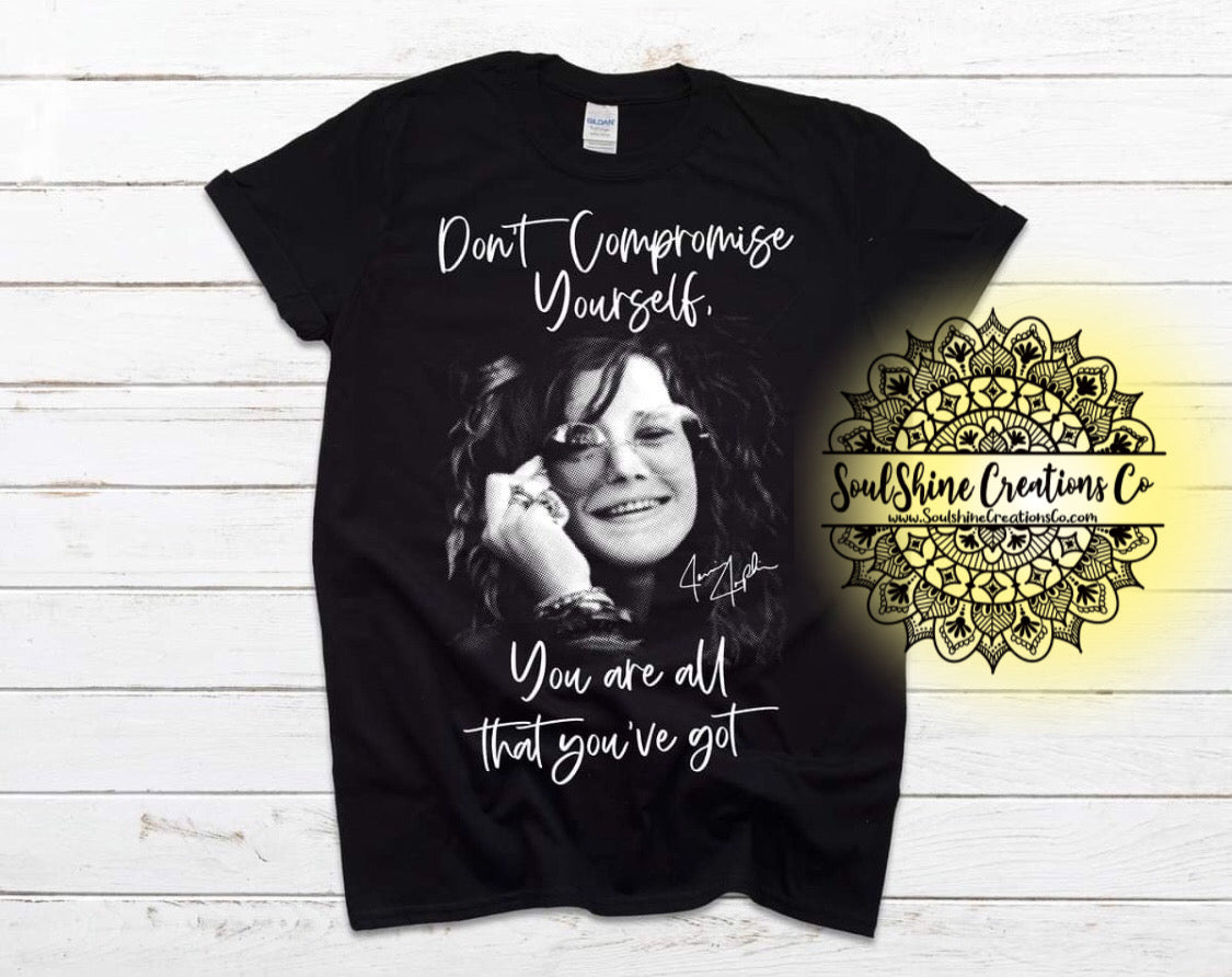 Don’t compromise yourself you’re all you’ve got Janis Joplin shirt- (Color of shirt in photo is Black, for reference)