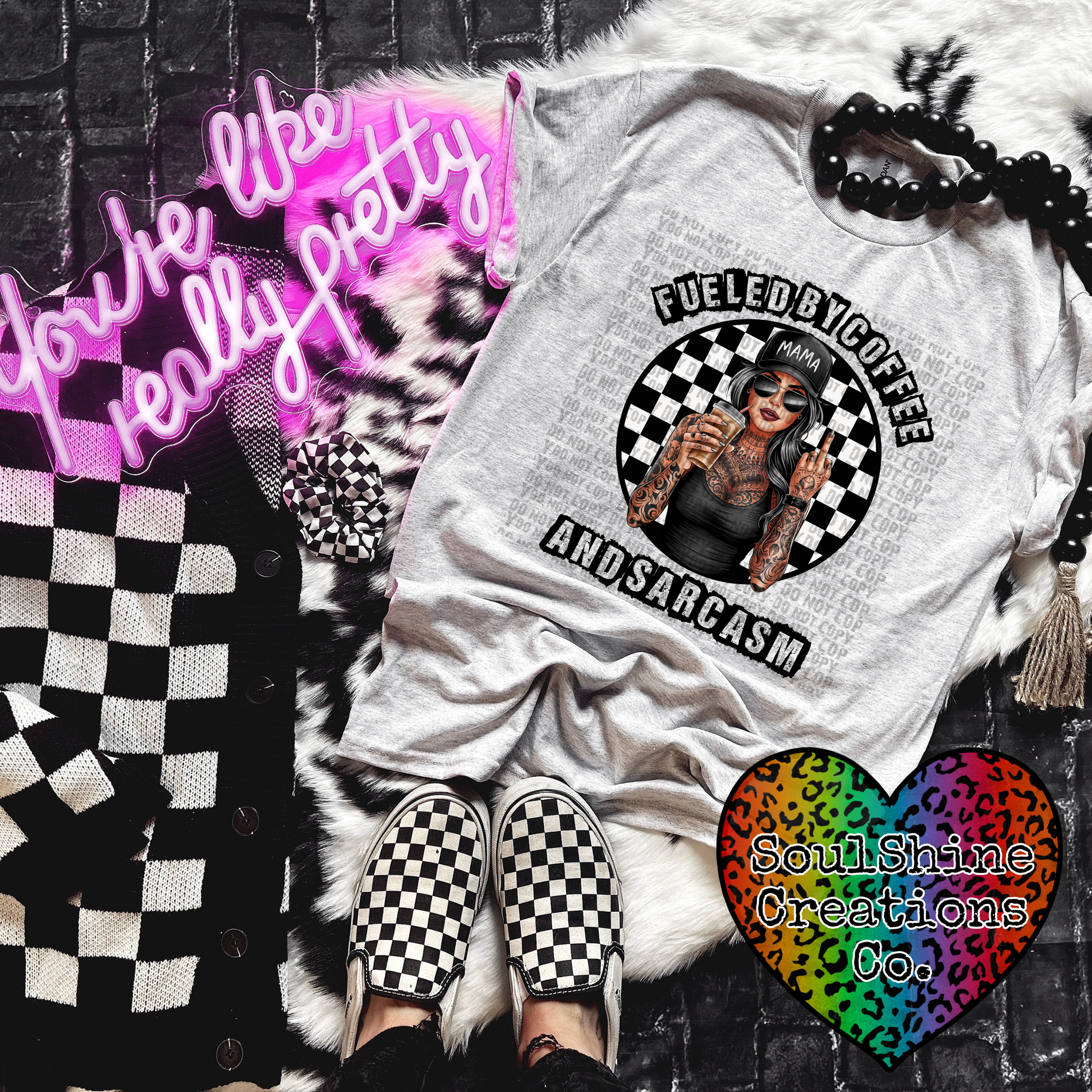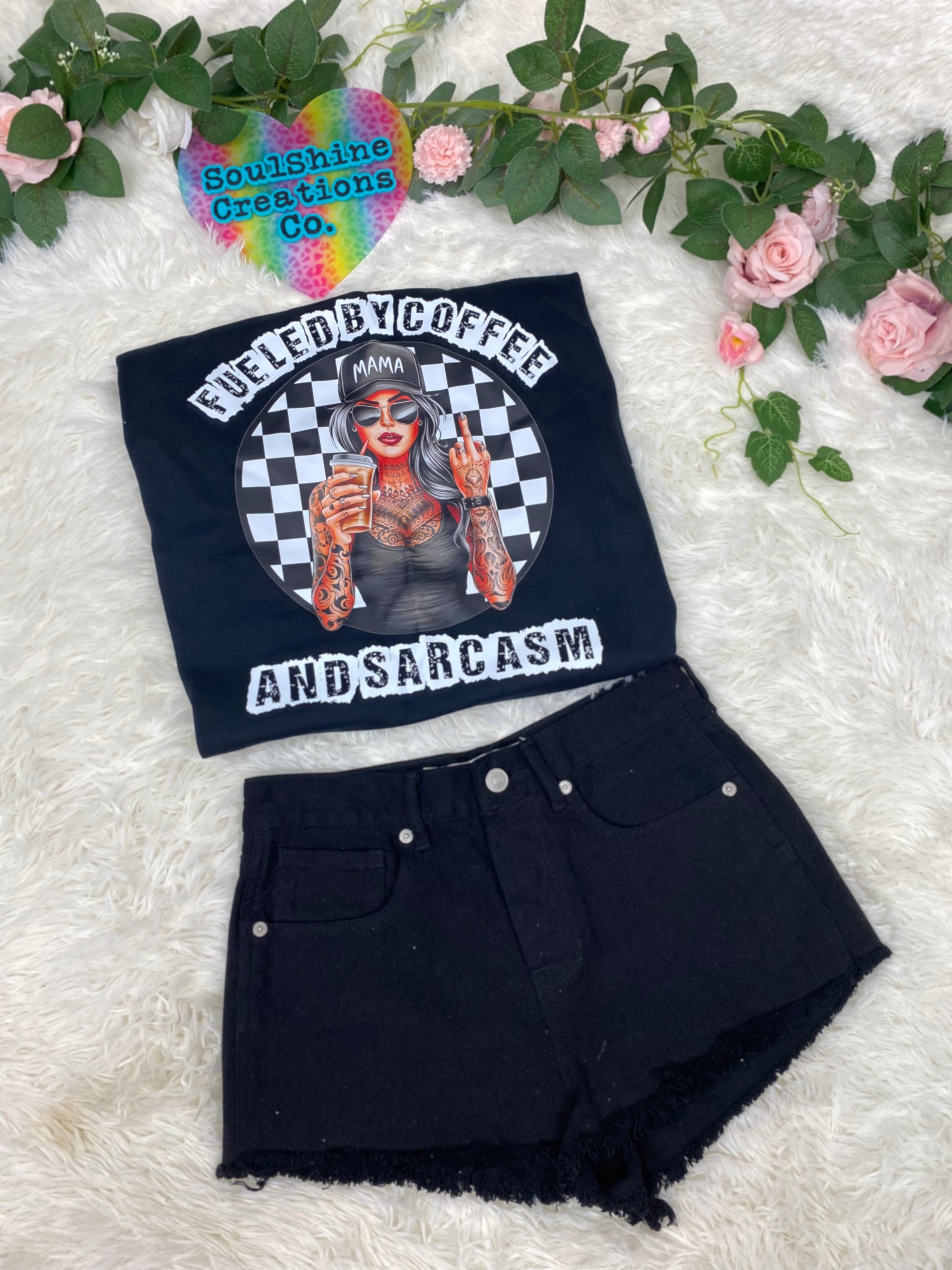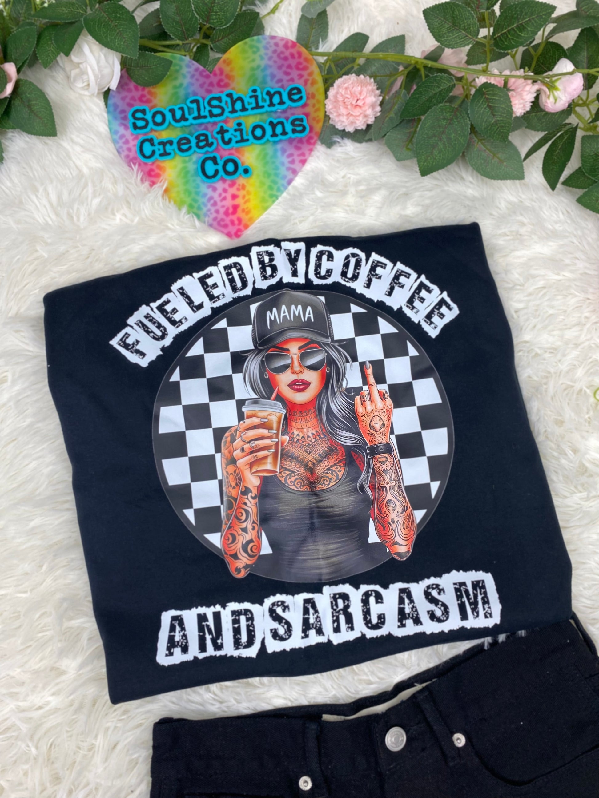 Stay comfortable and stylish with our "Fueled By Coffee and Sarcasm" tee or sweater for the sassy mama in you! With its witty design and soft fabric, you'll be fueled and ready to take on the day. Perfect for running errands or lounging at home. Available now!