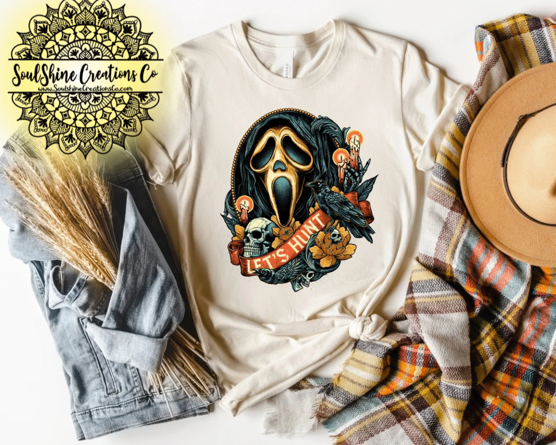 Ghostface Let’s Hunt Shirt- (Color of shirt in photo is Natural, for reference)