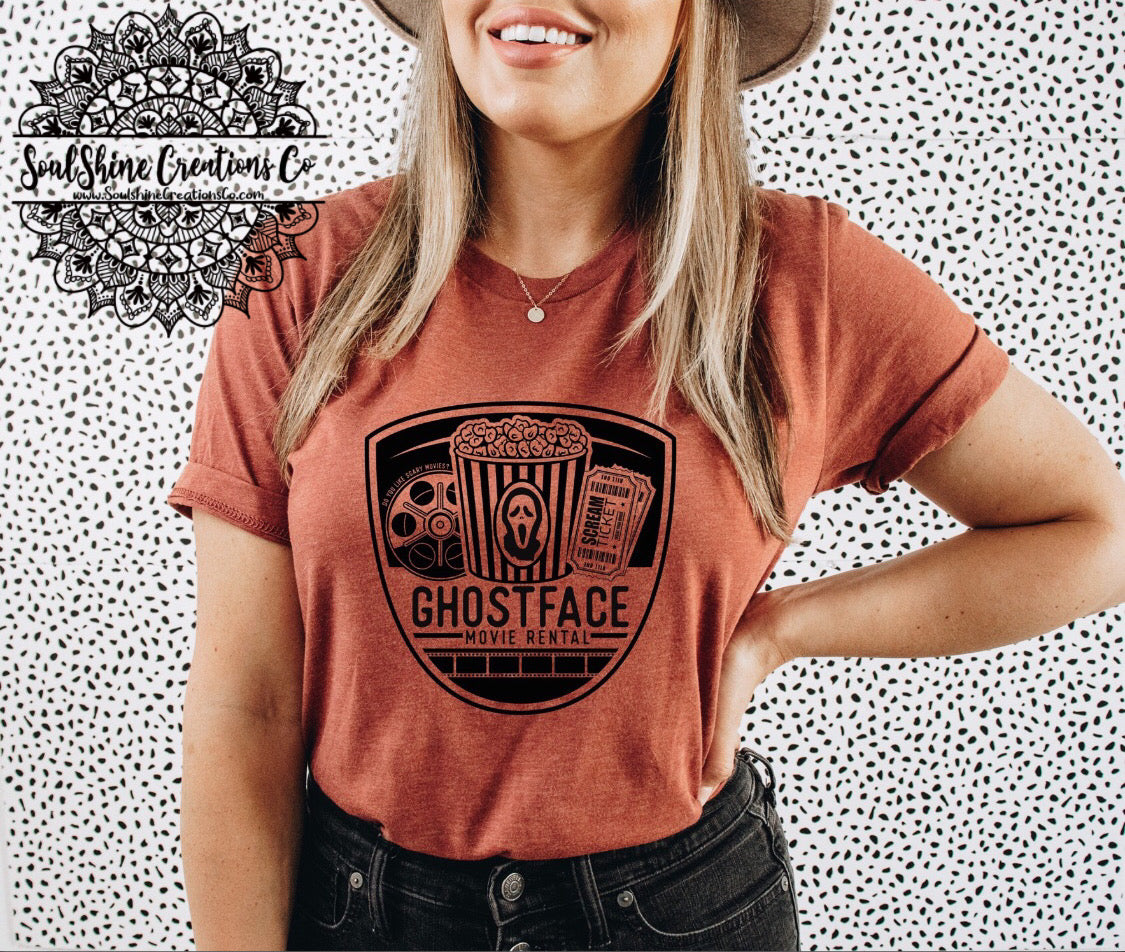 Ghostface Movie Rental shirt- (Color of shirt in photo is Heather Autumn & Purple, for reference)