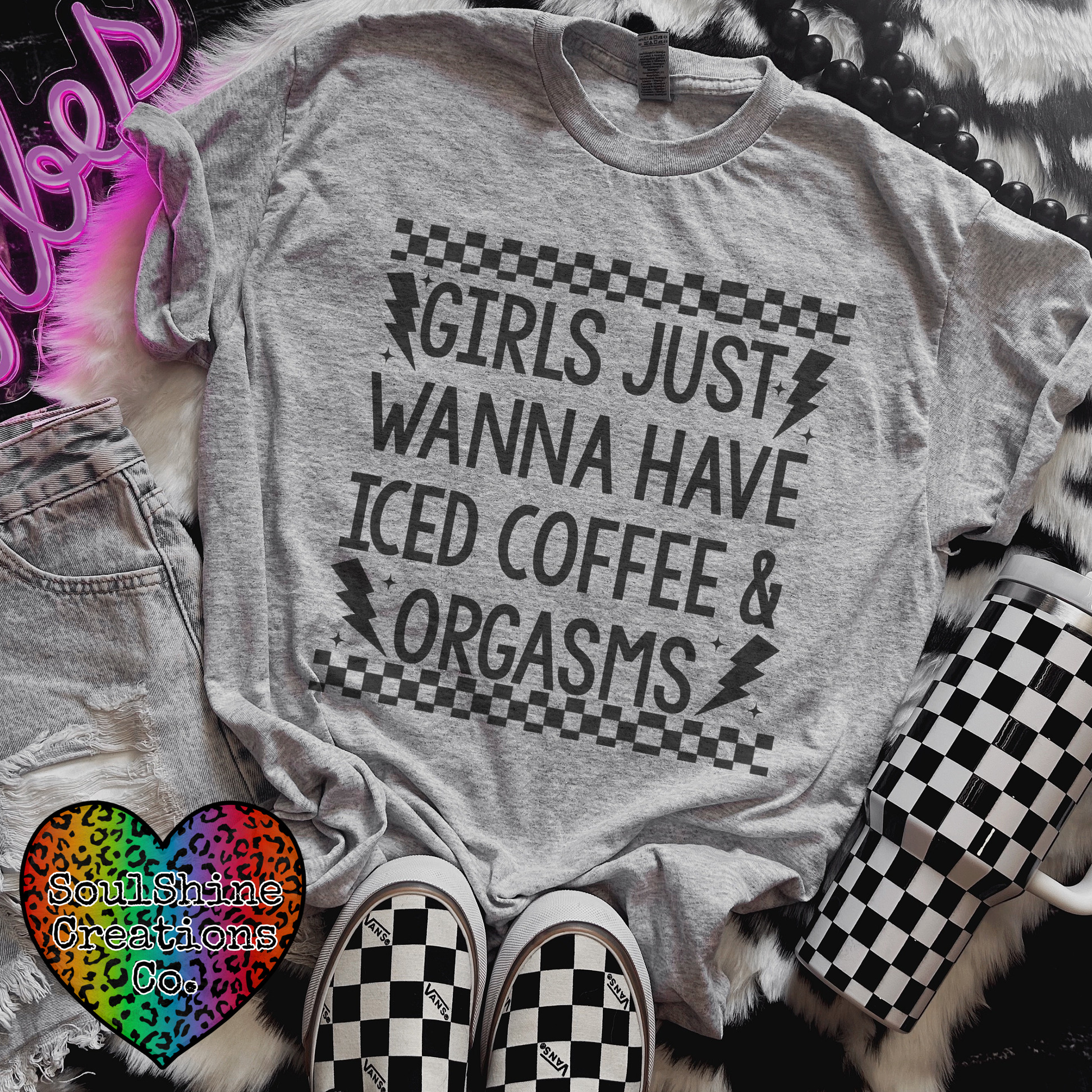 Girls just wanna have Iced Coffee & Orgasms Funny Graphic Tee Shirt