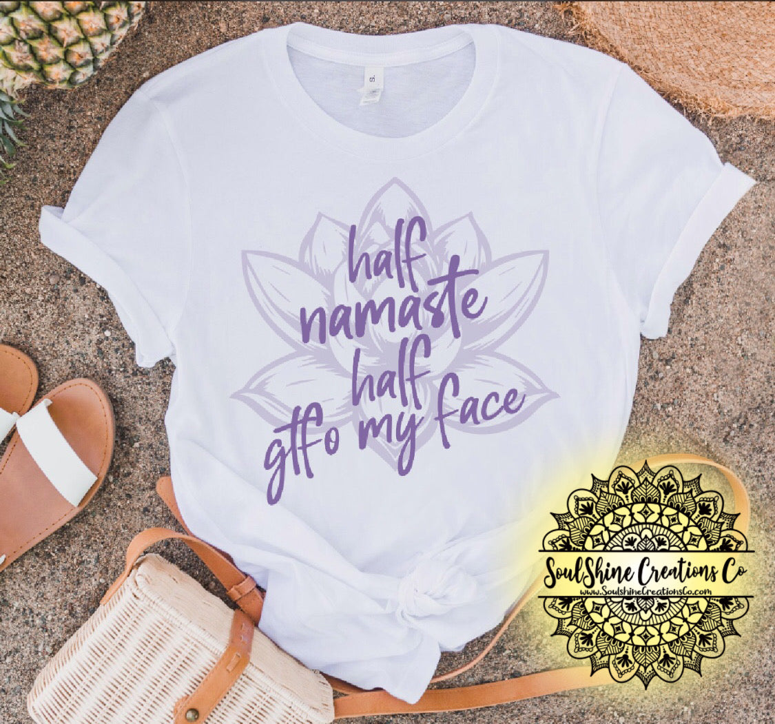Half Namaste half gtfo my face shirt- (Color of shirt in photo is White, for reference)
