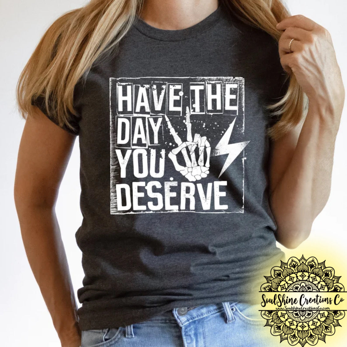 Have the Day you deserve shirt- (Color of shirt in photo is Dark Gray Heather, for reference)