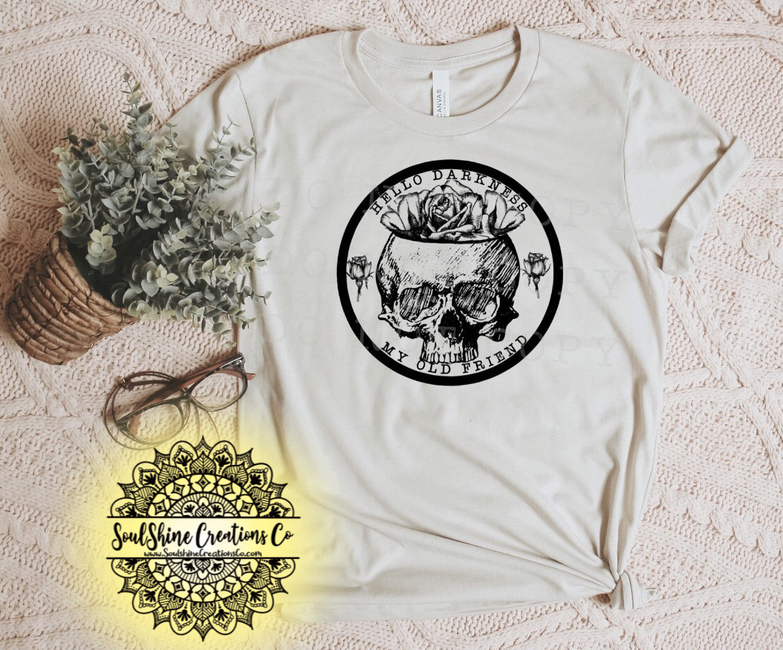 Hello darkness my old friend shirt- (Color of shirt in photo is White, for reference)