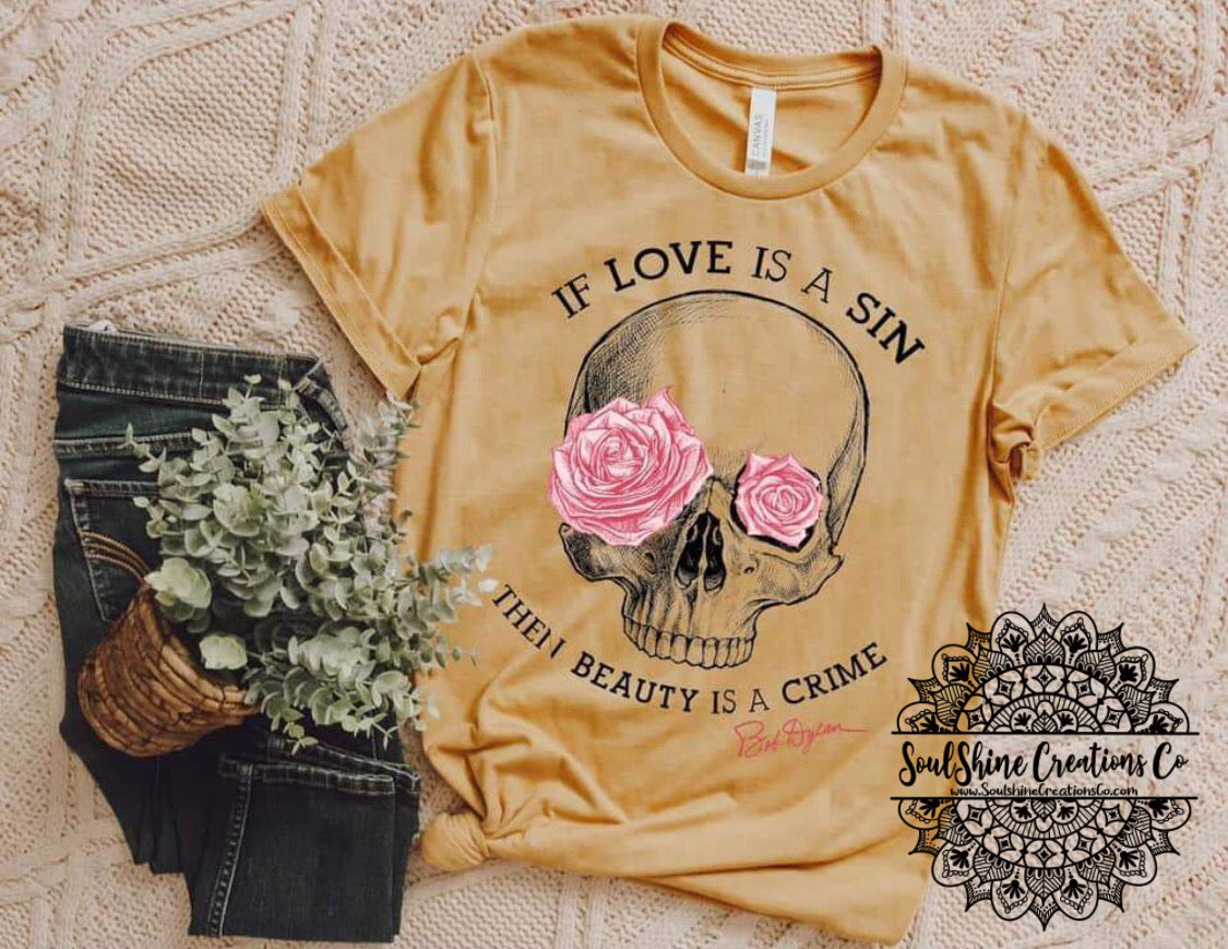 If love is a sin then beauty is a crime shirt- (Color of shirt in photo is Mustard, for reference)