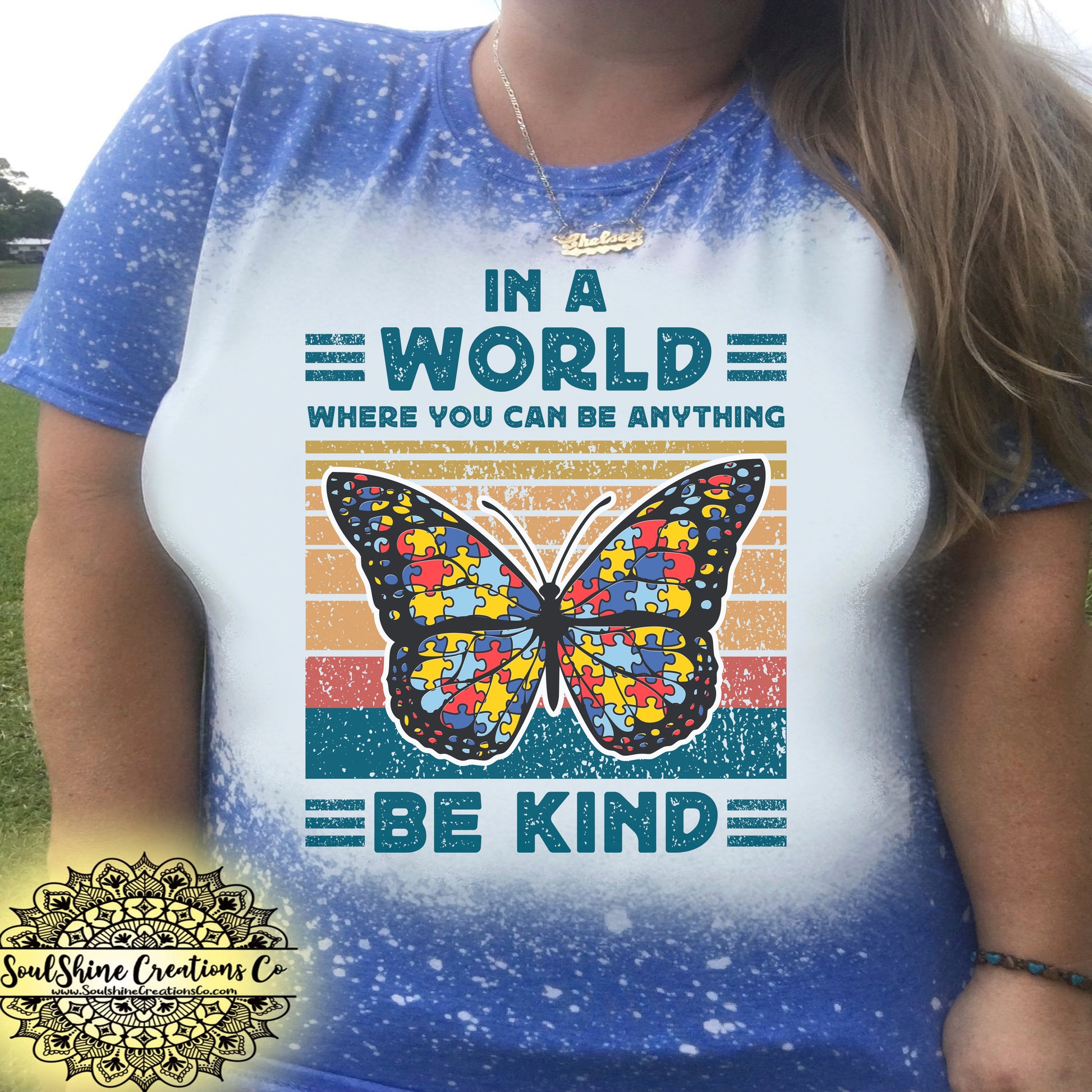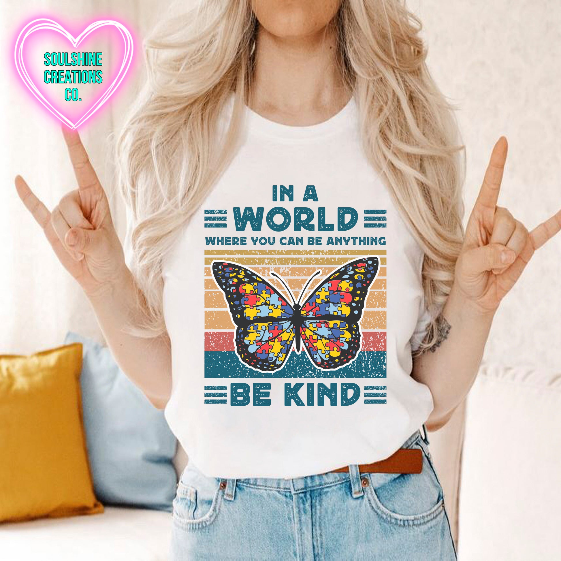 Be kind and make a statement in this powerful autism awareness shirt! Featuring the inspirational phrase, 'In a world where you can be anything, be kind', this comfy and stylish shirt is a great way to start conversations and spread awareness. Show your support: wear your heart on your sleeve!