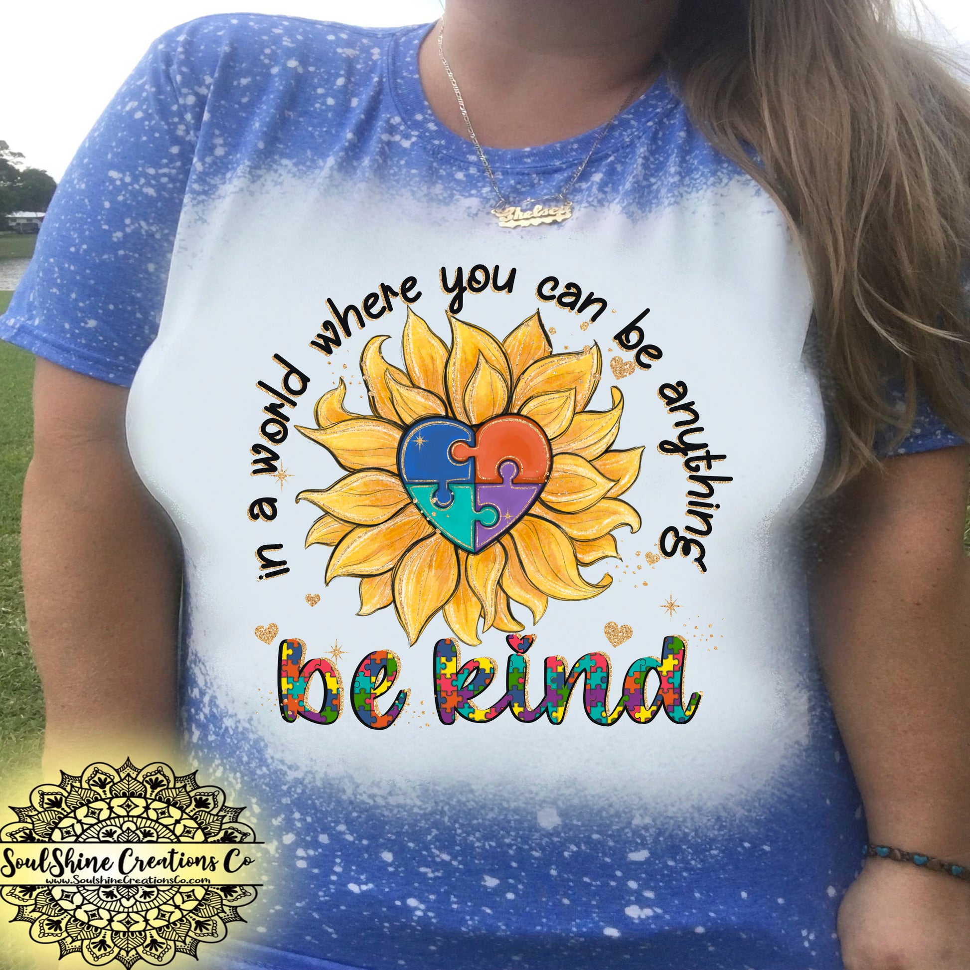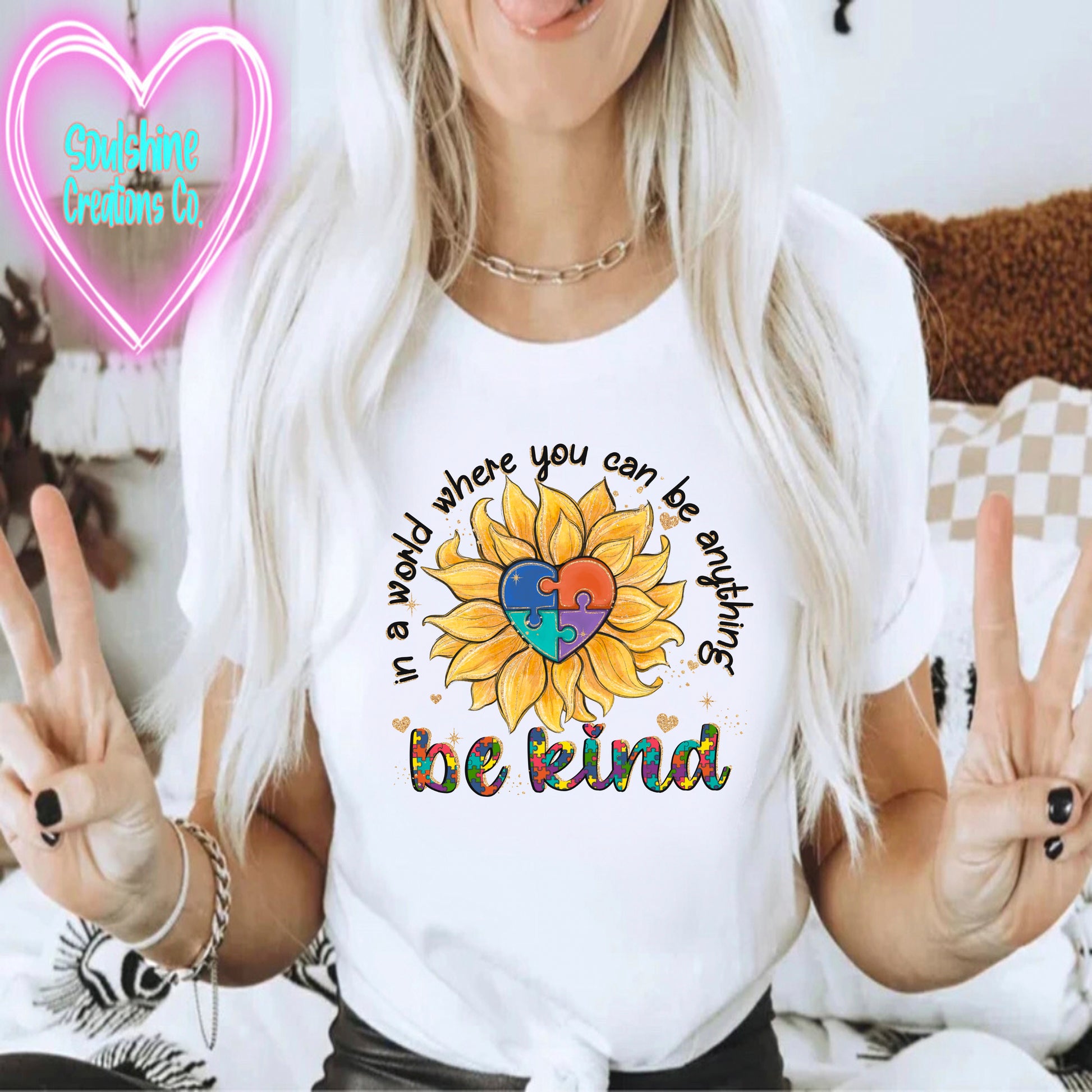 Be kind and make a statement in this powerful autism awareness shirt! Featuring the inspirational phrase, 'In a world where you can be anything, be kind', this comfy and stylish shirt is a great way to start conversations and spread awareness. Show your support: wear your heart on your sleeve!