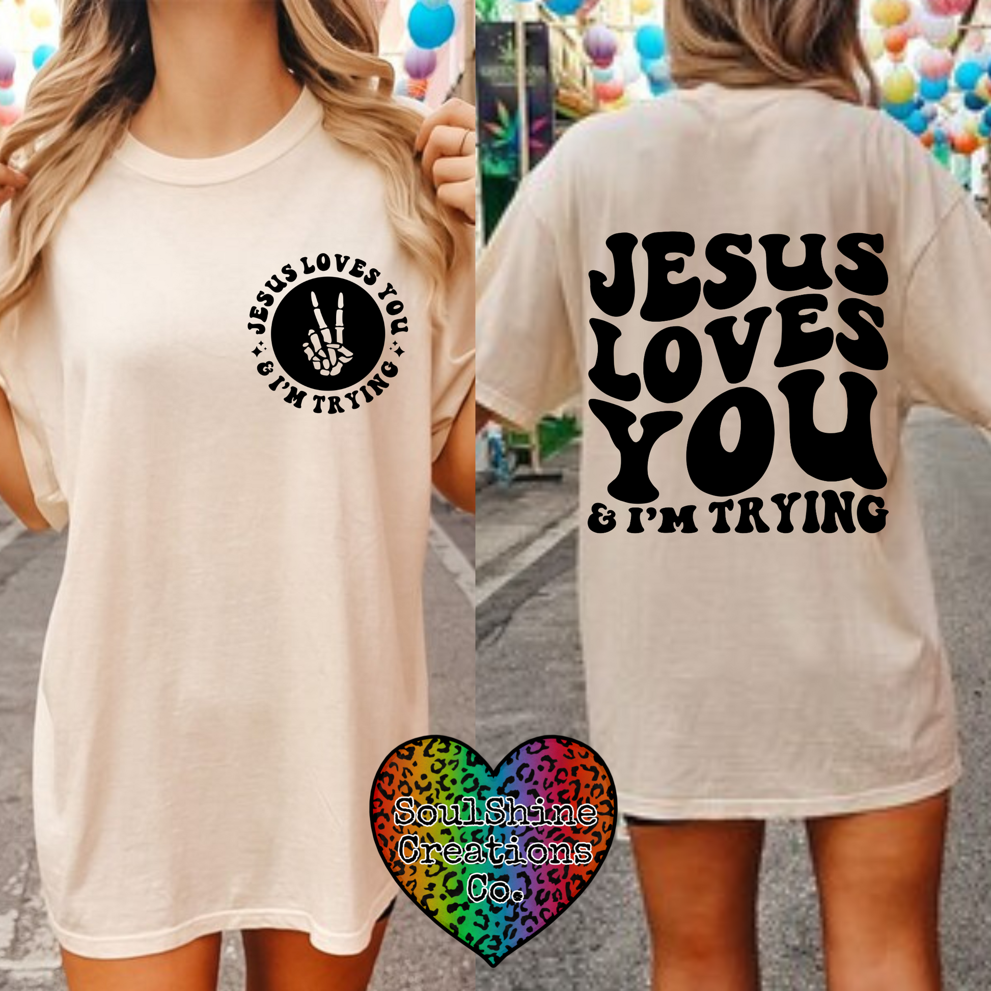Introducing a saucy, brand-new tee or sweatshirt that will have you proudly proclaiming, " Jesus Loves You & I'm Trying!" Wear your faith and good humor.