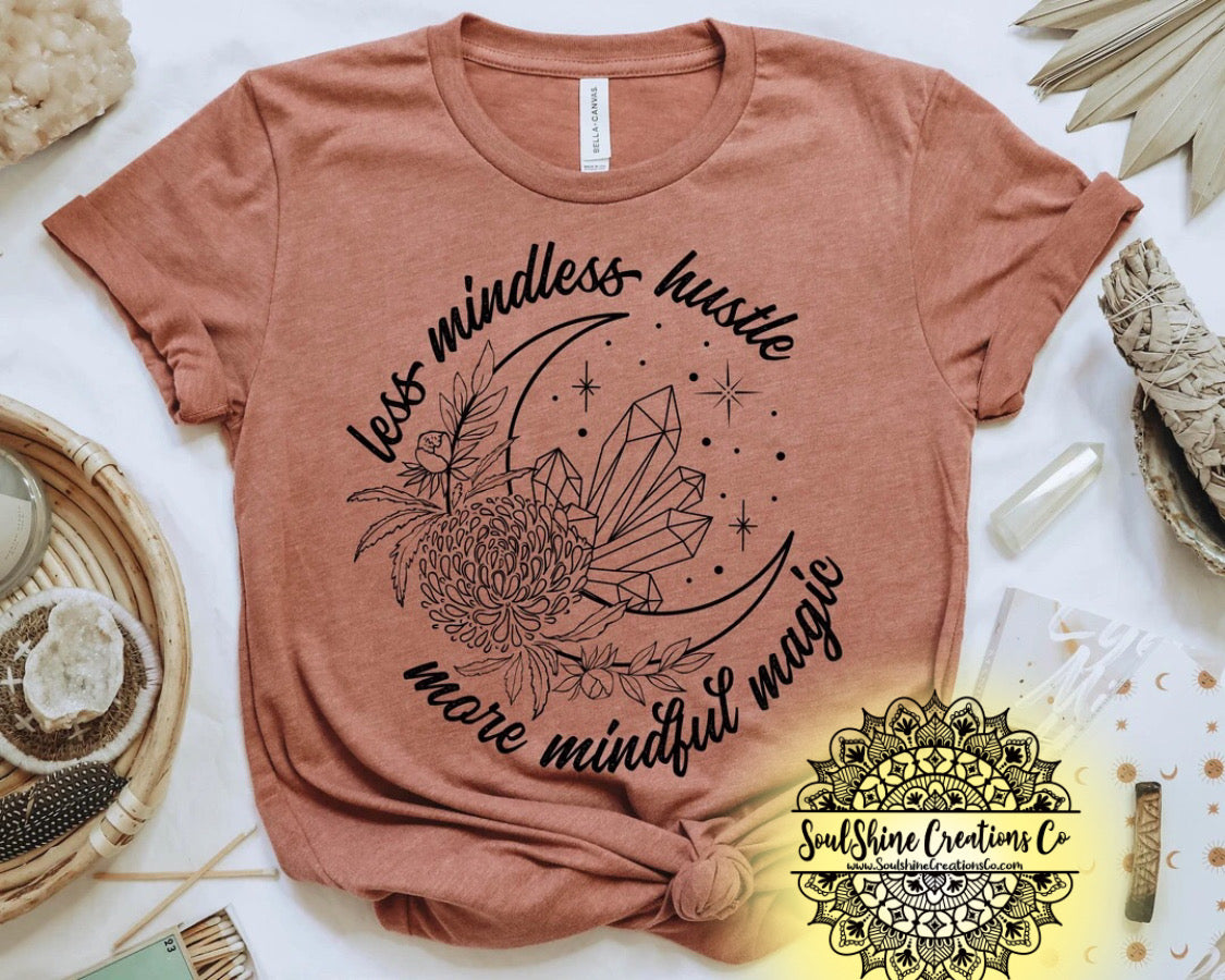 Less Mindless Hustle More Mindful Magic shirt- (Color of shirt in photo is Heather Clay, for reference)