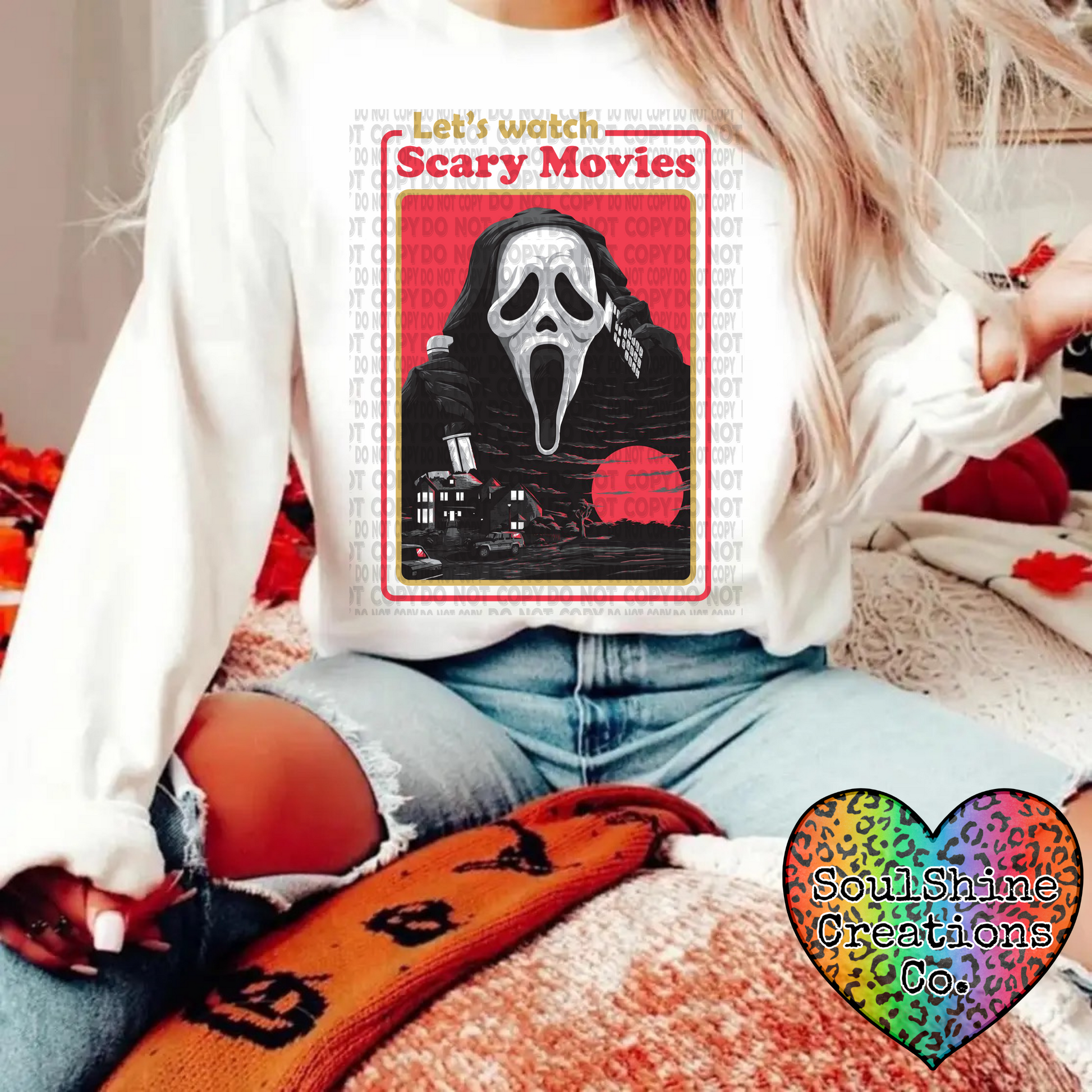 Let’s watch scary movies Tee or Sweater is perfect for any retro-loving Halloween enthusiast! Show off your spooky style in this unique design - sure to make you the life of the party!