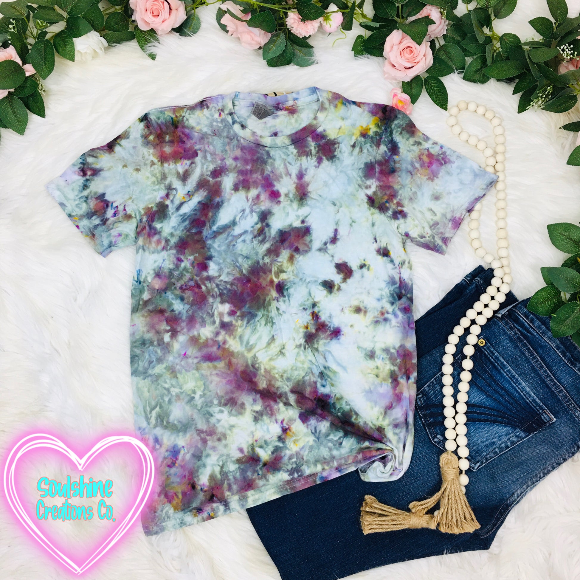 PLEASE NOTICE THAT TIE DYEING IS AN UNPREDICTABLE PROCESS. NO TWO PIECES WILL BE EXACTLY THE SAME. PLEASE EMBRACE THE UNIQUENESS OF EACH HAND DYED PIECE.