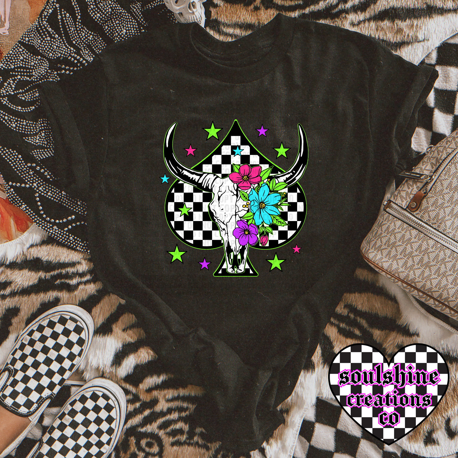 Neon Checkered Spade Western Bull Skull Yallternative tee or sweater-Edgy Alternative Vibes