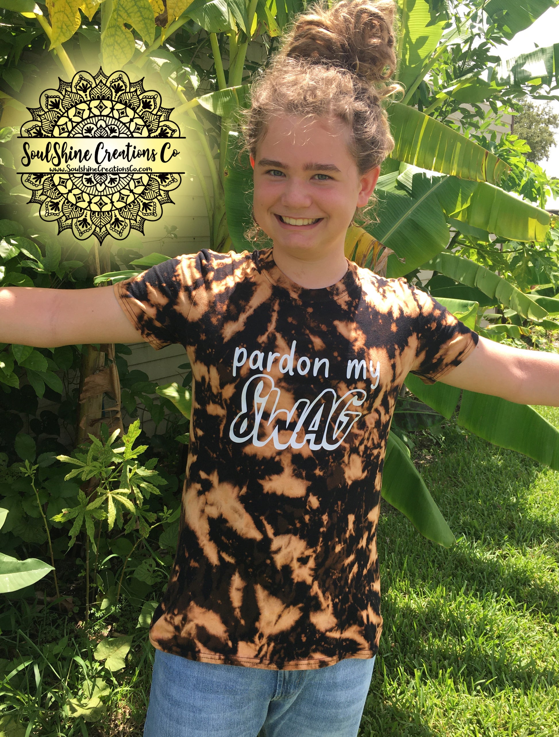 Each shirt is made on a quality tee with a unique bleach dying process and designs are applied using a professional grade heat-press for permanent, and lasting design.