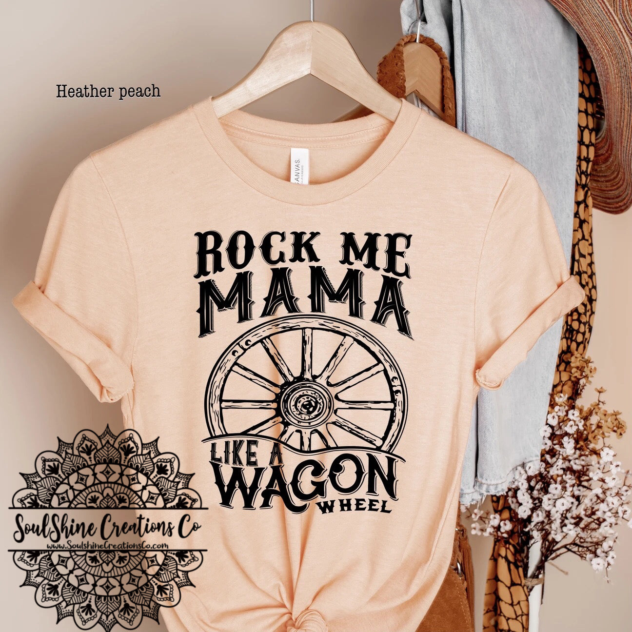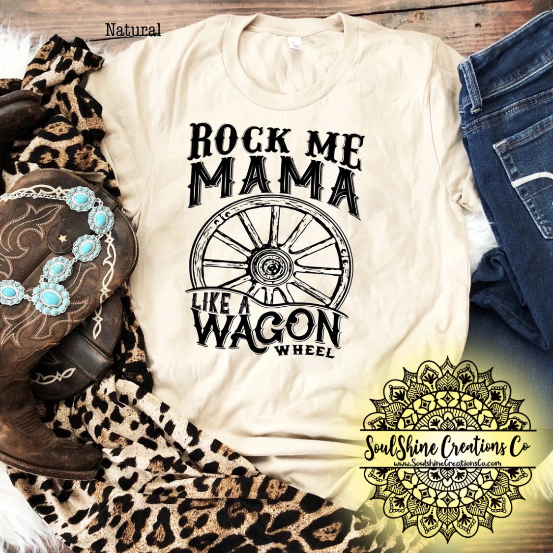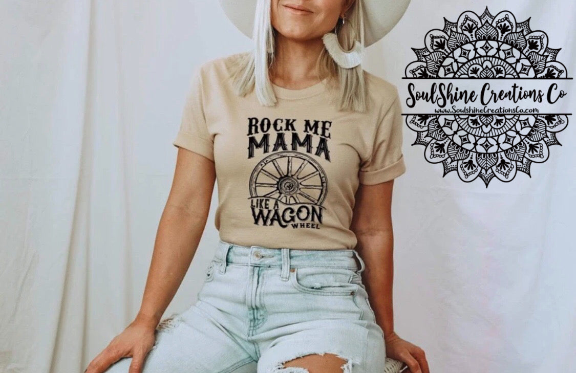 Rock me mama like a wagon wheel shirt- (Color of shirt in photo is Tan, Natural & Peach, for reference)