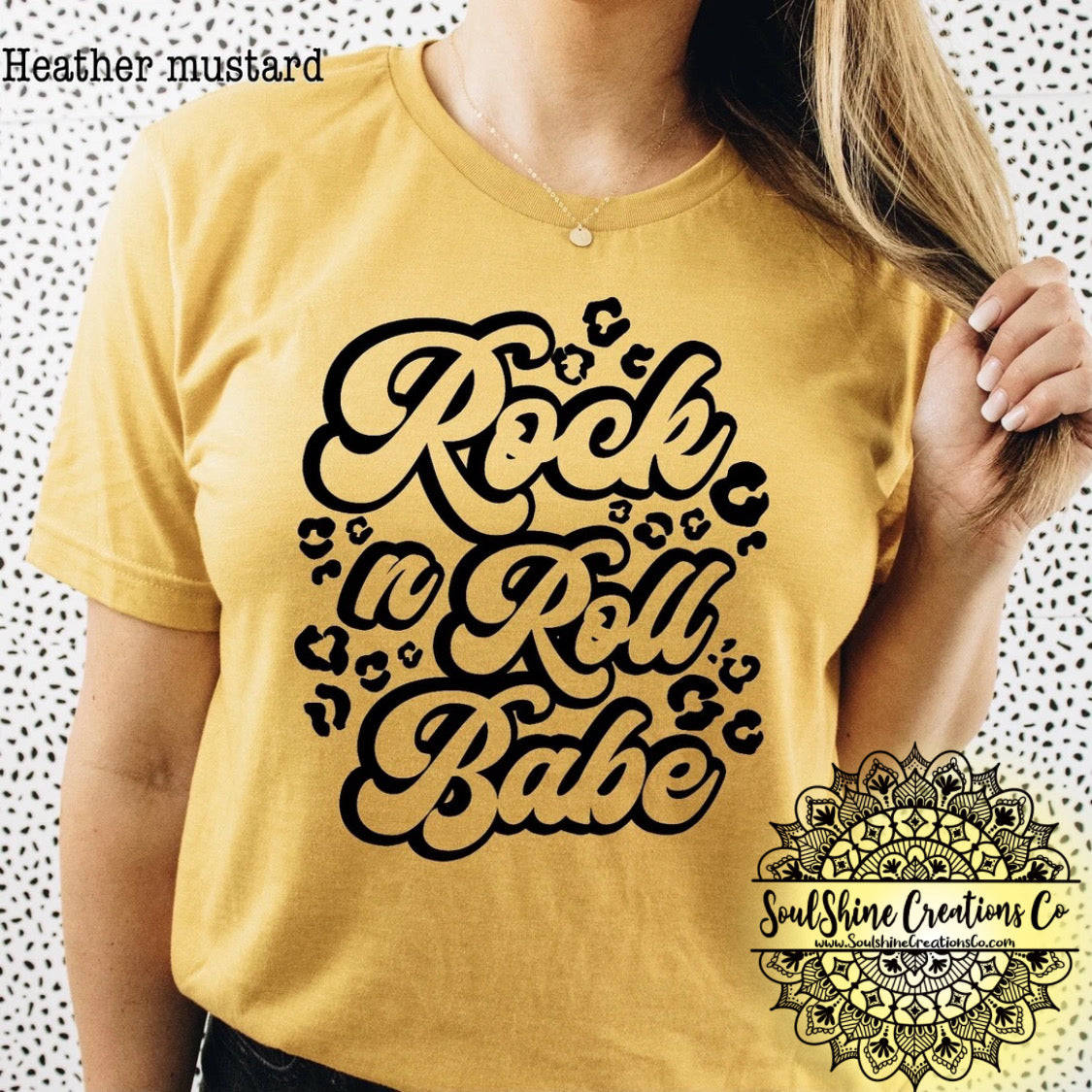 Rock n Roll Leopard Print shirt- (Color of shirt in photo is Heather Mustard, for reference)