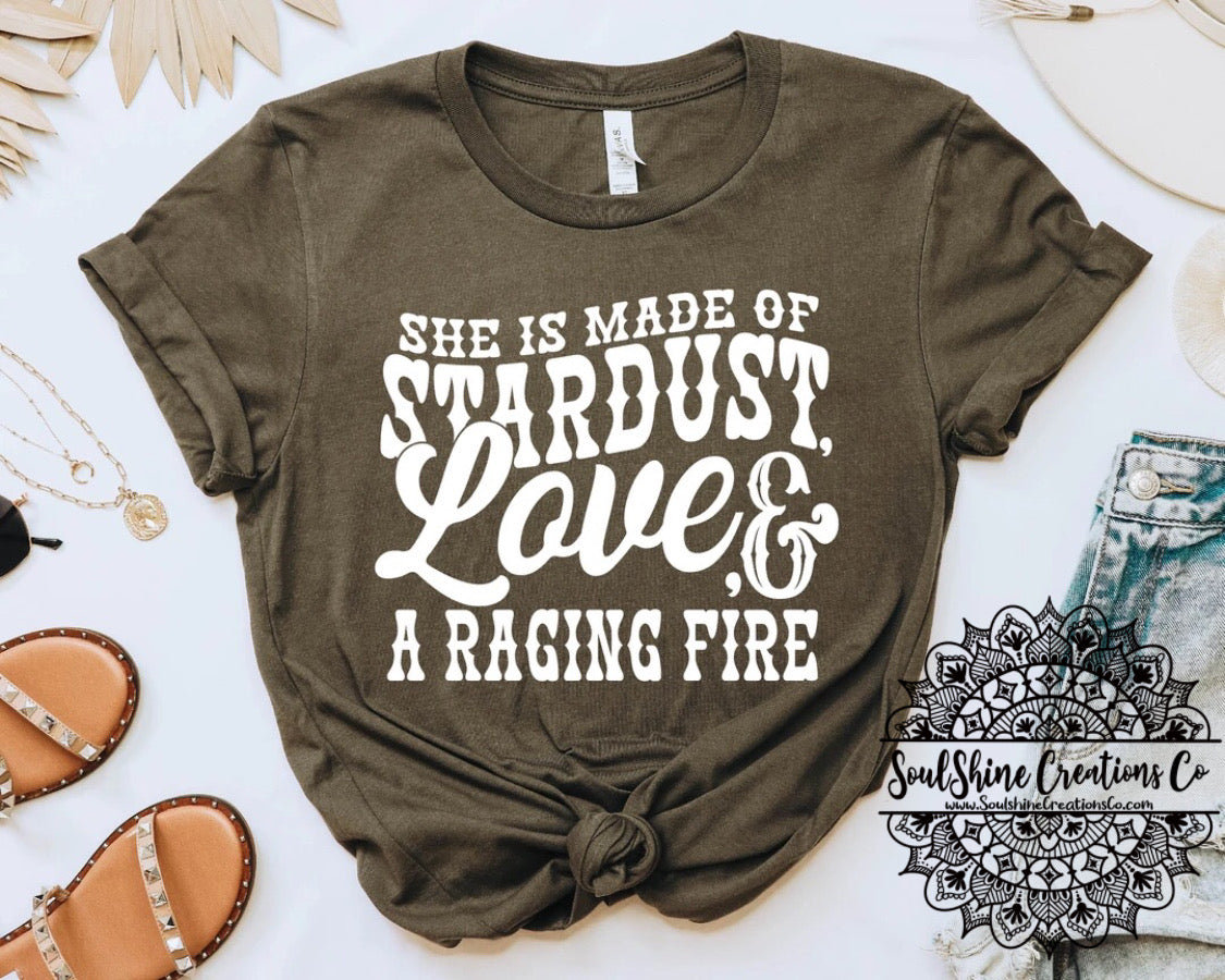 She’s made of Stardust,Love,& a raging fire shirt- (Color of shirt in photo is Olive, for reference)