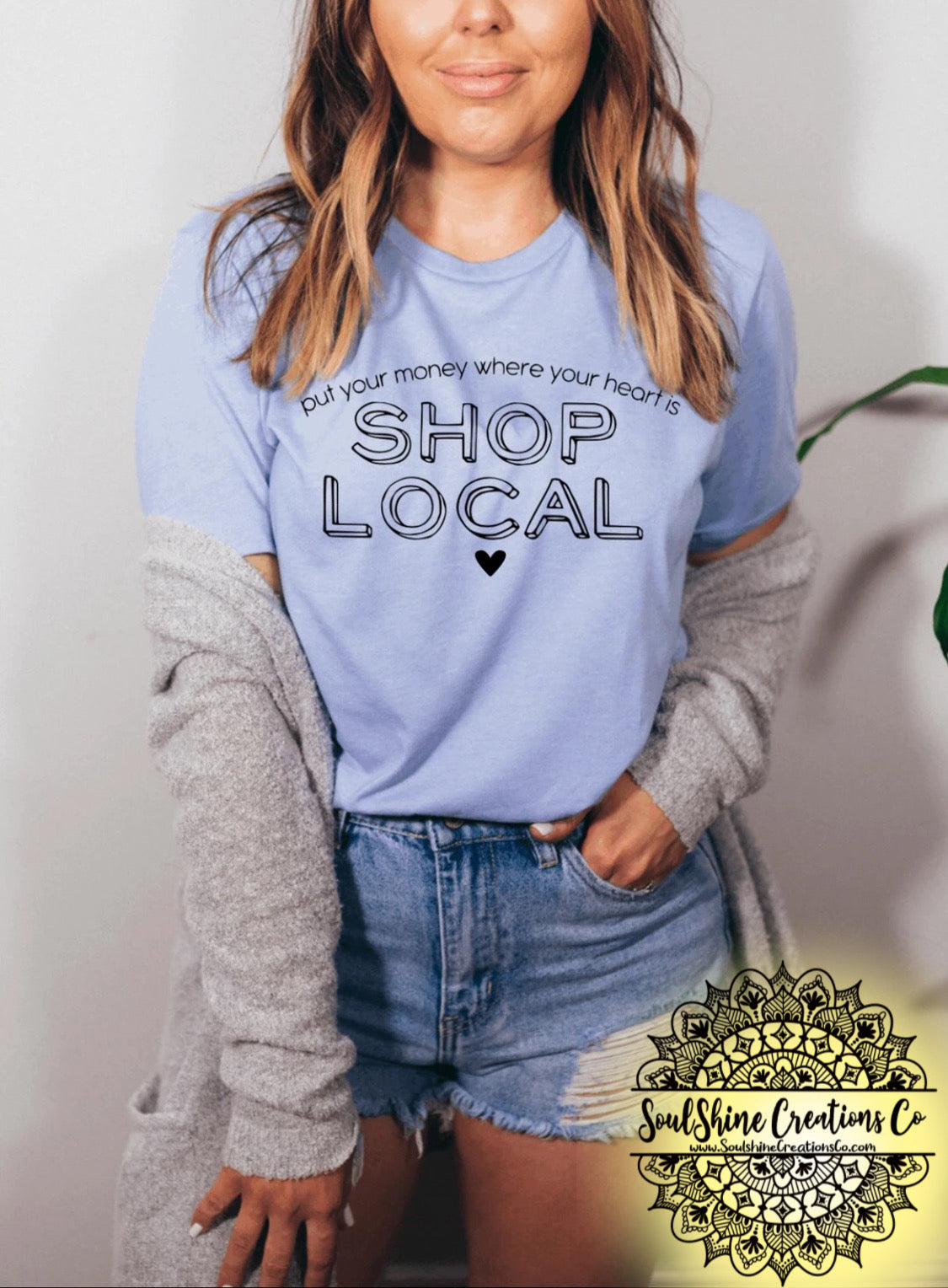 Shop Local shirt- (Color of shirt in photo is Light Blue, for reference)