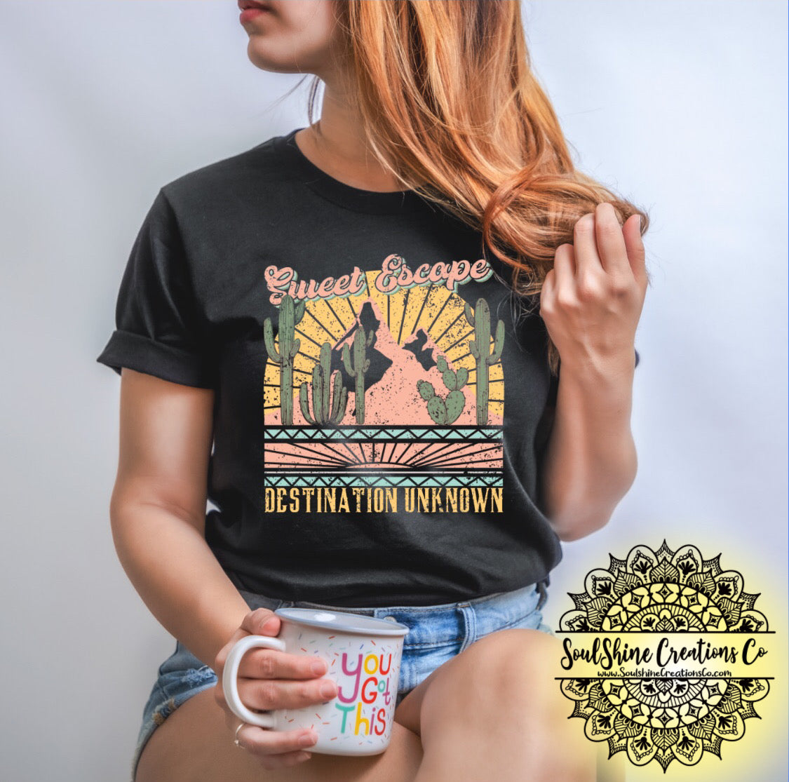 Sweet escape destination unknown shirt- (Color of shirt in photo is Black, for reference)