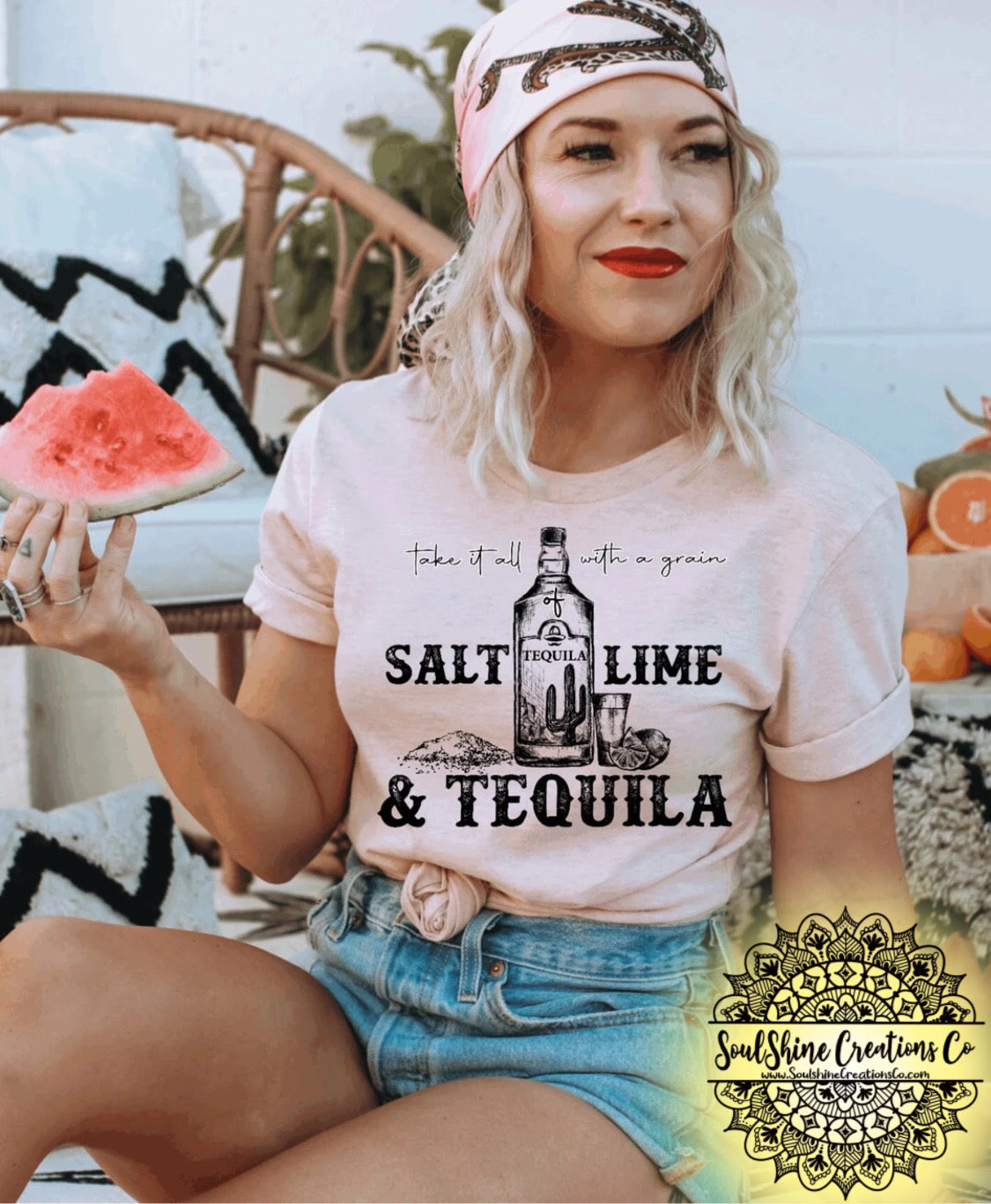 Take it all with a grain of salt lime & tequila shirt- (Color of shirt in photo is Soft Pink, for reference)