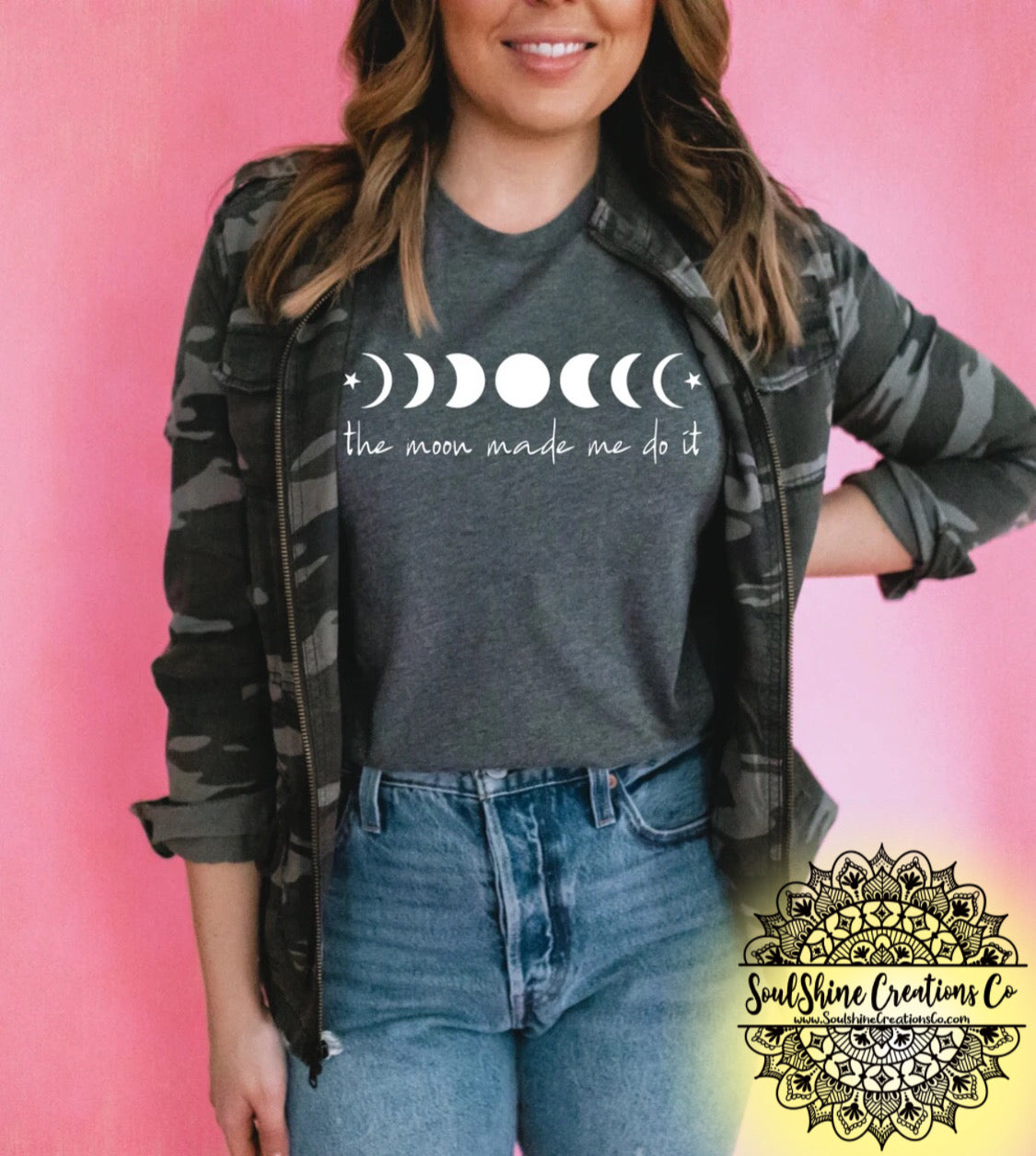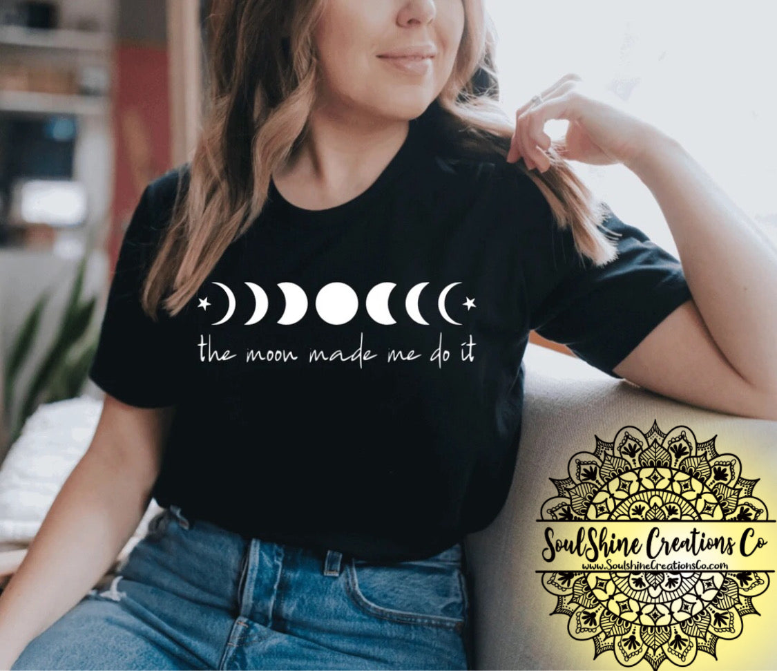 The moon made me do it shirt- (Color of shirt in photo is Black & Dark Grey, for reference)