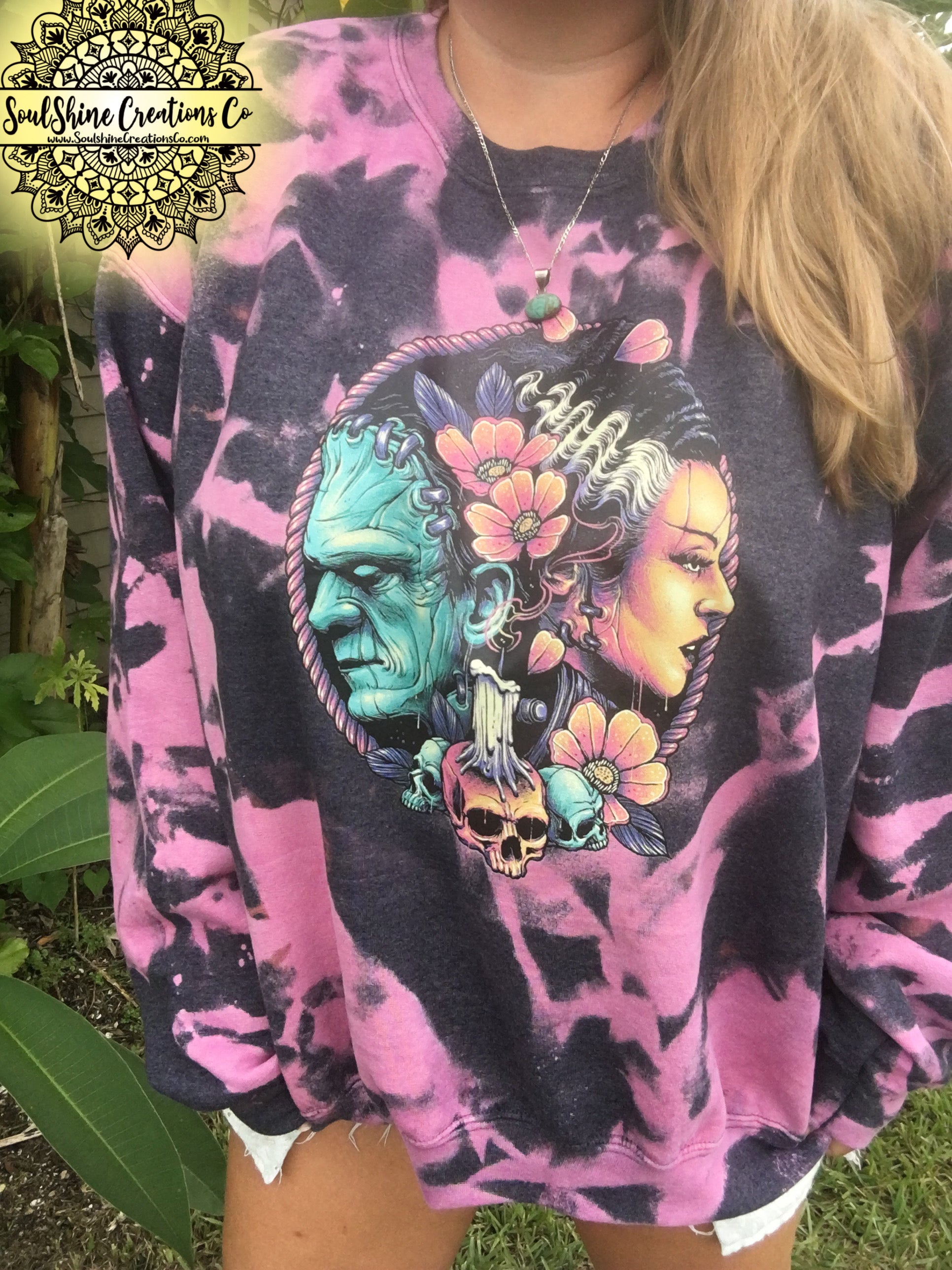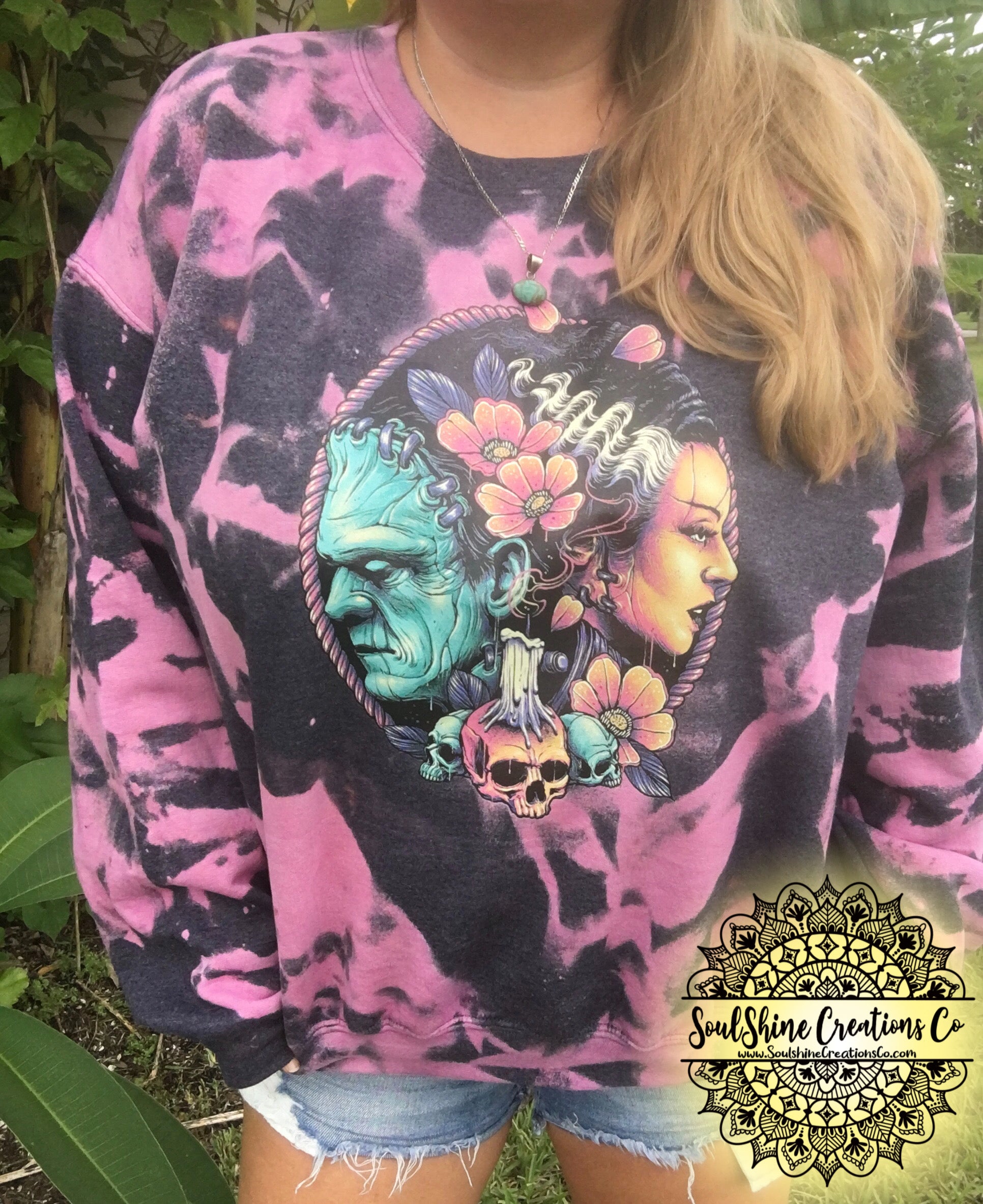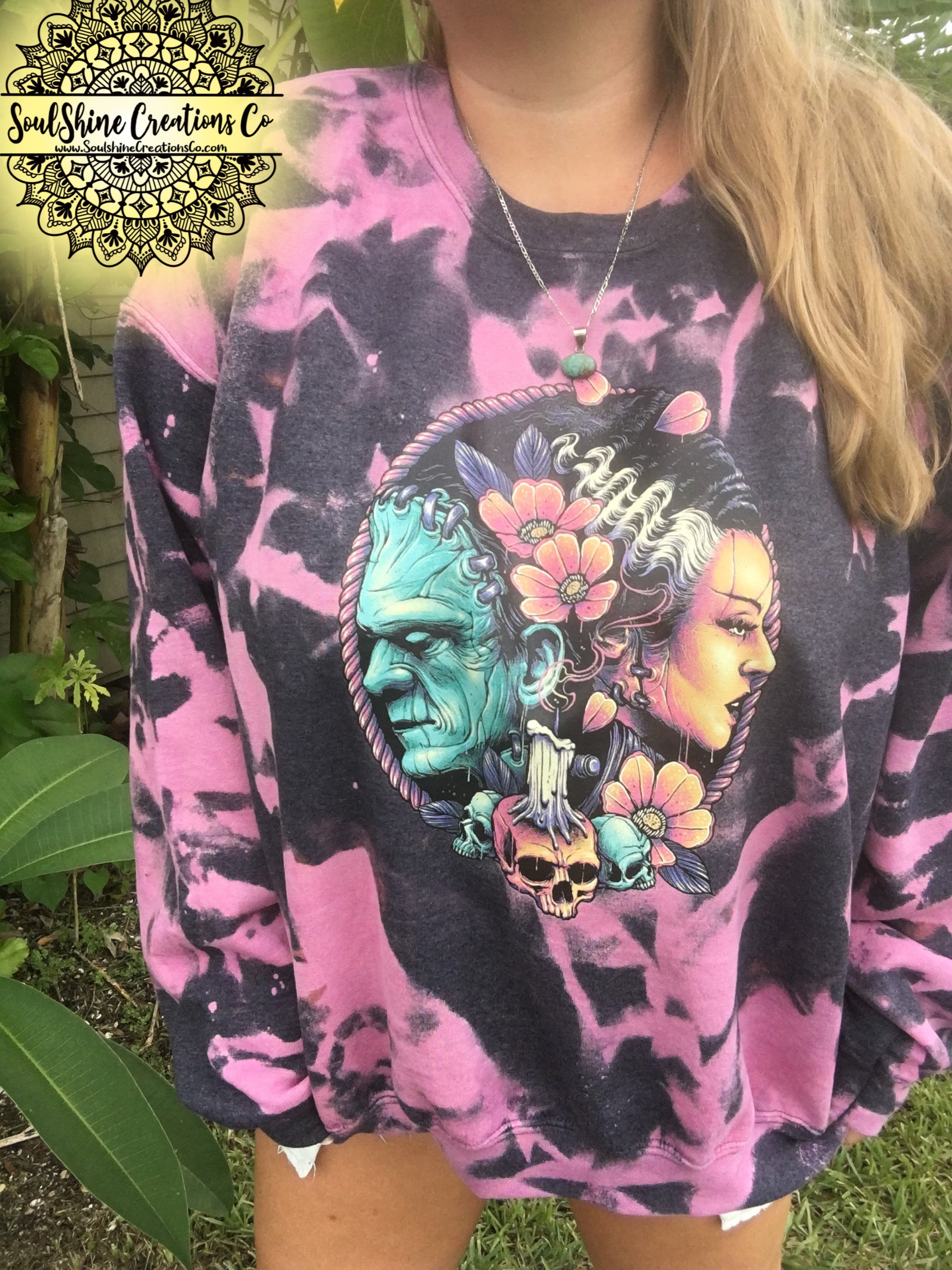 Each sweatshirt is made on a quality unisex sweater with a unique bleach dying process and screen prints are applied using a professional grade heat-press for permanent, and lasting design.