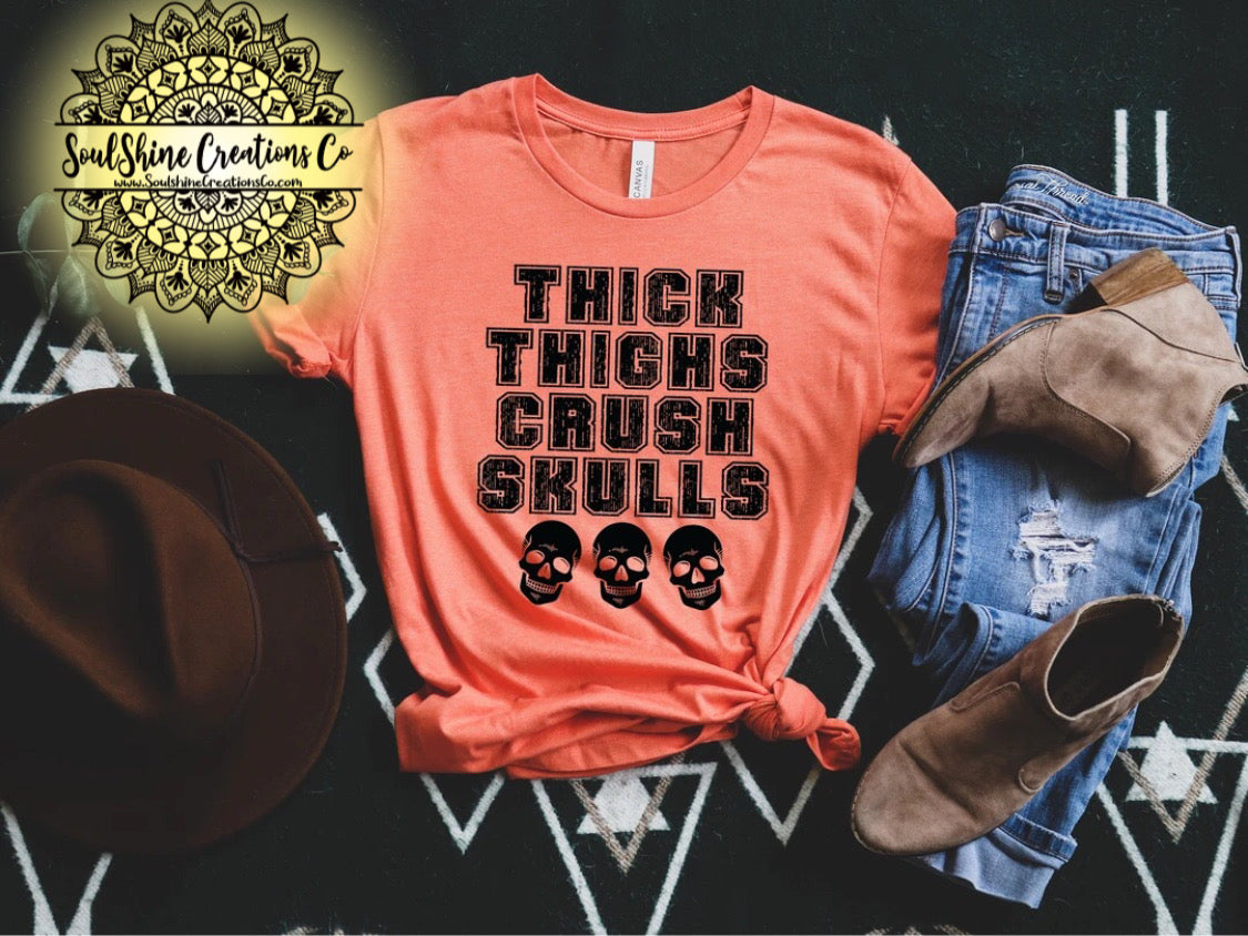 Thick thighs crush skulls Shirt- (Color of shirt in photo is Heather Orange , for reference)