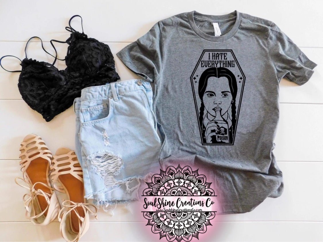 Wednesday Adams I hate Everything Shirt- (Color of shirt in photo is Gray, for reference)