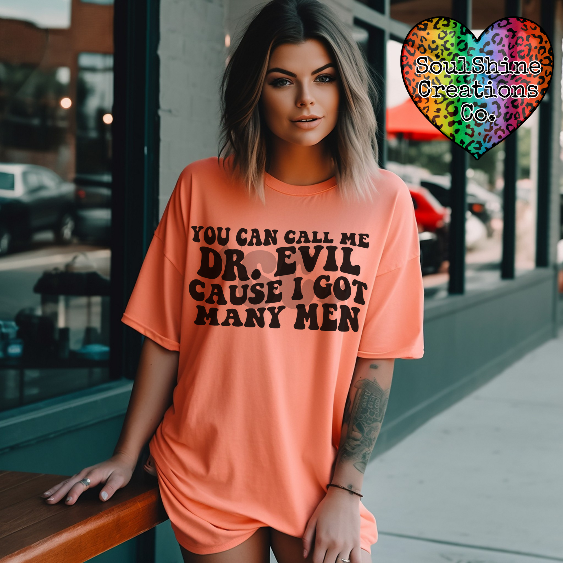 Introducing a saucy, brand-new tee or sweatshirt that will have you proudly proclaiming, "You can call me Dr. Evil cause I got many men!"